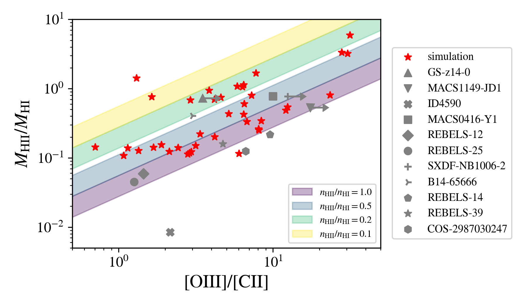 Furthermore, we found that the [O III]/[C II] ratio scales linearly with the mass and density ratios of ionized to neutral gas, and naturally decreases from high to low redshift. We also confirmed the validity of our scaling relation by deriving \(M_\mathrm{HII}/M_\mathrm{HI}\) for observed \(z>6\) galaxies using JWST- Hβ and ALMA-[C II] measurements (Figure 2).